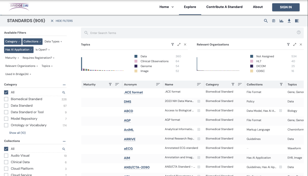 A searchable web platform for discovering and exploring data standards used across Bridge2AI projects, designed to improve transparency, consistency, and reuse.