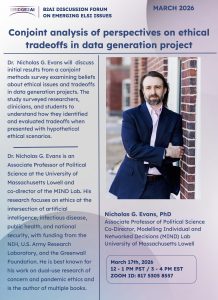 Please join us on Tuesday, March 17th 2026 at 12pm-1pm PST/3pm-4pm EST for the discussion forum: “Conjoint analysis of perspectives on ethical tradeoffs in data generation project”, by Dr. Dr. Nicholas G. Evans.