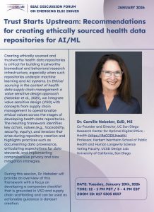 Please join us on Tuesday, January 20th, 2026 at 12pm-1pm PST/3pm-4pm EST for the discussion forum: “Trust Starts Upstream: Recommendations for creating ethically sourced health data repositories for AI/ML,” by Dr. Camille Nebeker.