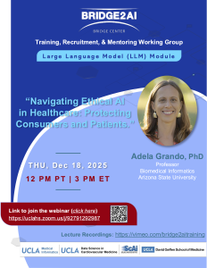 Join us on Thursday, December 18, 2025, at 12:00 PM PT/3:00 PM ET for the lecture: “Navigating Ethical AI in Healthcare: Protecting Consumers and Patients” with Adela Grand, PhD. This will be the 6th installment in the Bridge2AI Training, Recruitment, and Mentoring (TRM) 2025-26 Lecture Series Large Language Model (LLM) Module.