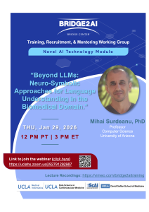 “Join us on Thursday, January 29, 2026, at 12:00 PM PT/3:00 PM ET for the lecture: “Beyond LLMs: Neuro-Symbolic Approaches for Language Understanding in the Biomedical Domain” by Dr. Mihai Surdeanu. This lecture is part of the Bridge2AI Training, Recruitment, and Mentoring (TRM) 2025-26 Lecture Series Novel AI Technology Module.